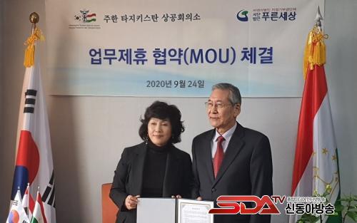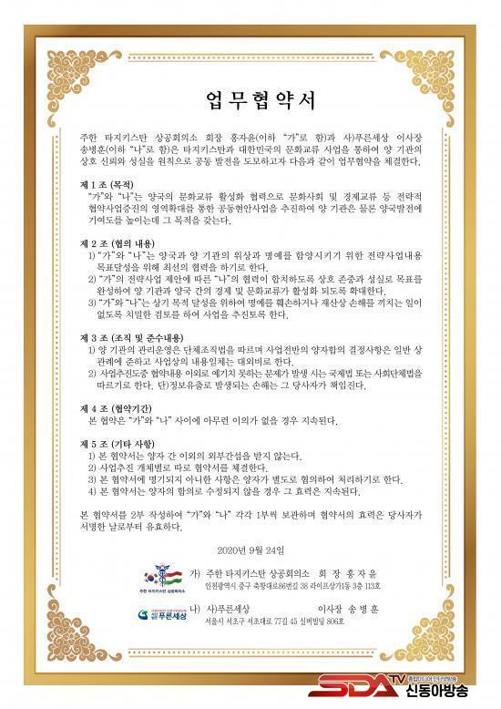 [½Åµ¿¾Æ¹æ¼Û=À̽ŵ¿ ±âÀÚ] (»ç)Ǫ¸¥¼¼»ó(ÀÌ»çÀå ¼Ûº´ÈÆ)ÀÌ Å¸ÁöŰ½ºÅº ÁÖÇÑ »ó°øÈ¸ÀǼÒ(ȸÀå È«ÀÚÀ±)¿Í Áö³­ 24ÀÏ ¹®È­±³·ù ¾÷¹«Á¦ÈÞ Çù¾à½Ä ÀÎõ¿¡¼­ °¡Á³´Ù.