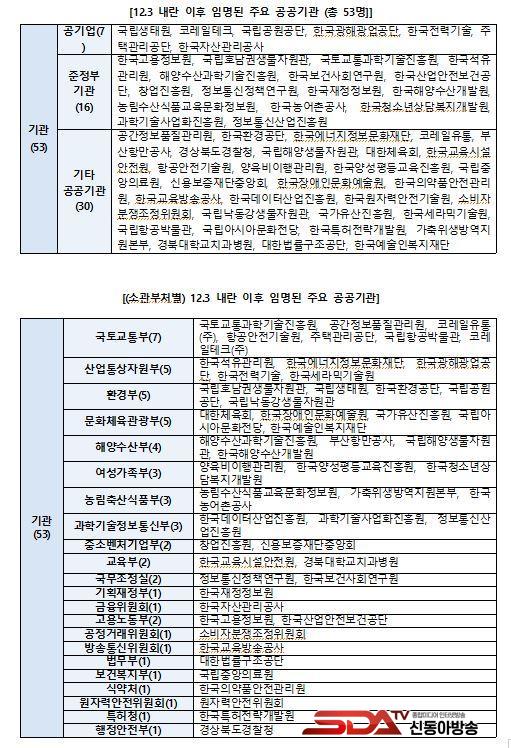 ÀÌ¿Í ÇÔ²², 12¿ù 3ÀÏ ÀÌÈÄ ÀÓ¸íµÈ °ø°ø±â°üÀå 53¸íÀÇ ¼Ò°ü ÁÖ¹« ºÎó¸¦ ºÐ¼®ÇÑ °á°ú, Àλ簡 ƯÁ¤ ºÎó¿¡ ÁýÁßµÈ ¾ç»óÀÌ ¶Ñ·ÇÇÏ°Ô ³ªÅ¸³µ´Ù. ±¹Åä±³ÅëºÎ°¡ 7¸íÀ¸·Î °¡Àå ¸¹¾Ò°í, »ê¾÷Åë»óÀÚ¿øºÎ¡¤È¯°æºÎ¡¤¹®ÈüÀ°°ü±¤ºÎ°¡ °¢°¢ 5¸í¾¿À¸·Î µÚ¸¦ À̾ú´Ù. ¡ãÇØ¾ç¼ö»êºÎ 4¸í, ¡ã¿©¼º°¡Á·ºÎ¡¤³ó¸²Ãà»ê½ÄǰºÎ¡¤°úÇбâ¼úÁ¤º¸Åë½ÅºÎ °¢ 3¸í, ¡ãÁß¼Òº¥Ã³±â¾÷ºÎ¡¤±³À°ºÎ¡¤±¹¹«Á¶Á¤½Ç¡¤°í¿ë³ëµ¿ºÎ °¢ 2¸í, ¡ã±âȹÀçÁ¤ºÎ‧±ÝÀ¶À§¿øÈ¸‧°øÁ¤°Å·¡À§¿øÈ¸¡¤¹æ¼ÛÅë½ÅÀ§¿øÈ¸¡¤¹ý¹«ºÎ¡¤º¸°Çº¹ÁöºÎ¡¤½Ä¾à󡤿øÀڷ¾ÈÀüÀ§¿øÈ¸¡¤Æ¯Çãû¡¤ÇàÁ¤¾ÈÀüºÎ´Â °¢°¢ 1¸í¾¿À̾ú´Ù. °¡Àå ¸¹Àº ¾Ë¹Ú±â Àλ縦 ÀÚÇàÇÑ ±¹ÅäºÎ, »ê¾÷ºÎ, ȯ°æºÎ, ¹®Ã¼ºÎ Àå°ü¿¡°Ô´Â ±×¿¡ ´ëÇÑ Ã¥ÀÓÀ» ³¡±îÁö ¹°¾î¾ß ÇÑ´Ù°í °Á¶Çß´Ù.