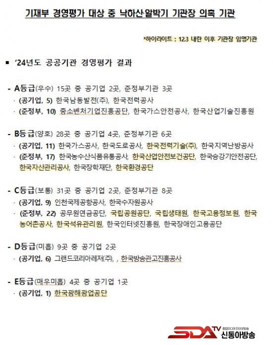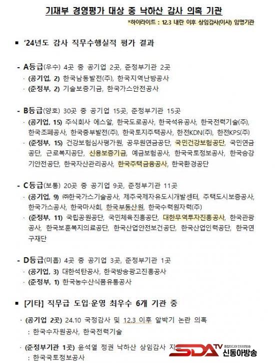 ÀÌ¿Í À¯»çÇÑ ¹®Á¦´Â 24³âµµ °¨»ç Á÷¹«¼öÇà½ÇÀû Æò°¡ °á°ú¿¡¼µµ ¹Ýº¹µÆ´Ù. Aµî±ÞÀ» ¹ÞÀº ±â°üÀº Çѱ¹³²µ¿¹ßÀü, Çѱ¹Áö¿ª³¹æ°ø»ç, ±â¼úº¸Áõ±â±Ý, Çѱ¹°¡½º¾ÈÀü°ø»ç µî 4°÷À̸ç, Bµî±ÞÀ» ¹ÞÀº ±â°üÀº ÃÑ 30°÷¿¡ ´ÞÇÑ´Ù. À̵é Áß¿¡´Â ¿¡½º¾Ë(SR), Çѱ¹µµ·Î°ø»ç, °Ç°º¸Çè½É»çÆò°¡¿ø, Çѱ¹ÁÖÅñÝÀ¶°ø»ç µî ÁÖ¿ä °ø°ø±â°üÀÌ Æ÷ÇԵǾî ÀÖÀ¸¸ç, »óÀÓ°¨»ç ¿ª½Ã ³«ÇÏ»ê ÀÎ»ç ³í¶õÀÇ Á߽ɿ¡ ÀÖ¾ú´ø Àι°µéÀÌ ´Ù¼ö Á¸ÀçÇÑ´Ù.