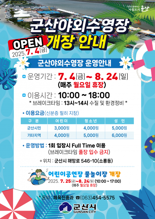 ¸ÕÀú ½Ã¹ÎµéÀÇ ¿©¸§Ã¶ ´ëÇ¥ ³ªµéÀÌ ¸í¼Ò·Î ÀÚ¸®¸Å±èÇÑ ±º»ê½Ã ¼Ò·æµ¿ ¼ÒÀç ¾ß¿Ü¼ö¿µÀåÀº 7¿ù 4ÀÏ(±Ý)ºÎÅÍ 8¿ù 24ÀÏ(ÀÏ)±îÁö ¹®À» ¿¬´Ù. ´Ü, ¸ÅÁÖ ¿ù¿äÀÏÀº ÈÞÀåÀÌ´Ù.