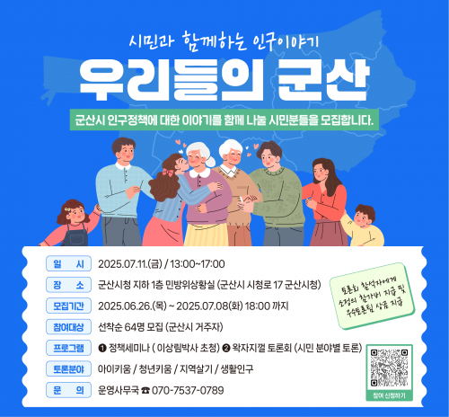 ½Ã¹ÎÅä·Ðȸ Âü¿© ´ë»óÀº ±º»ê½Ã¿¡ °ÅÁÖÇÏ´Â ½Ã¹ÎÀ¸·Î ¼±Âø¼ø ¸ðÁýÇϸç, ½ÅûÀº 7¿ù 8ÀϱîÁö, Æ÷½ºÅÍ ³» QR ºÎÈ£(ÄÚµå)¸¦ ÅëÇØ ¿Â¶óÀÎÀ¸·Î °¡´ÉÇÏ´Ù.