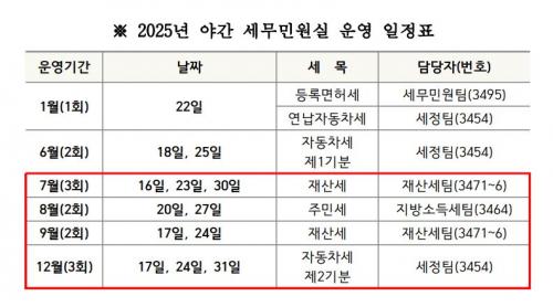 7¿ù ¾ß°£ ¼¼¹«¹Î¿ø½ÇÀº Àç»ê¼¼(6¿ù 1ÀÏ ±âÁØ ÁÖÅÃ, °ÇÃ๰, ¼±¹Ú ¼ÒÀ¯ÀÚ) ³³ºÎ ±â°£ÀÎ 7¿ù 16ÀÏ ~ 7¿ù 31ÀÏ Áß ¼ö¿äÀÏÀÎ 16ÀÏ¡¤23ÀÏ¡¤30ÀÏ ¿ÀÈÄ 6½ÃºÎÅÍ 9½Ã±îÁö 3½Ã°£ µ¿¾È ´çÁø½Ãû 1Ãþ ¼¼¹«°ú 43¹ø°ú 44¹ø ⱸ¿¡¼­ ¿î¿µÇÑ´Ù.