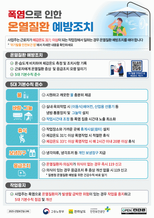 Àü³²µµ´Â Æø¿° ¼Ó ¿Â¿ÁúȯÀ» ¿¹¹æÇϱâ À§ÇØ ¡ã¹° ÀÚÁÖ ¸¶½Ã±â(°¥Áõ ´À³¢Áö ¾Êµµ·Ï Á¤±âÀû ¼·Ãë) ¡ãÇѳ· ¾ß¿Ü Ȱµ¿ ÀÚÁ¦(¿ÀÈÄ 2½Ã~5½Ã ÇÇÇϱâ) ¡ã½Ã¿øÇÑ ¿ÊÂ÷¸²°ú ÈÞ½Ä(¸Å 2½Ã°£ ÀÛ¾÷ ÈÄ 20ºÐ ÀÌ»ó ÈÞ½Ä) ¡ã¾îÁö·¯¿ò, ±ÙÀ°°æ·Ã ½Ã Áï½Ã Áß´ÜÇϰí 119 ½Å°í µî µµ¹Î°ú ÀÛ¾÷ÀÚ¿¡°Ô ¿¹¹æ ¼öÄ¢ Áؼö¸¦ ´çºÎÇß´Ù.