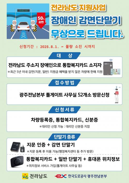 ½Åû ±â°£Àº 8¿ù 1ÀϺÎÅÍ ¹°·® ¼ÒÁø ½Ã±îÁö´Ù. ½ÅûÀº Àå¾ÖÀÎ ÅëÇÕº¹ÁöÄ«µå, ÀÚµ¿Â÷ µî·ÏÁõ°ú ½ÅºÐÁõÀ» ÁغñÇØ Çѱ¹µµ·Î°ø»ç ±¤ÁÖÀü³²º»ºÎ 52°³ Åç°ÔÀÌÆ® ¿µ¾÷¼Ò¿¡ Á÷Á¢ ¹æ¹®ÇØ ÇÏ¸é µÈ´Ù.