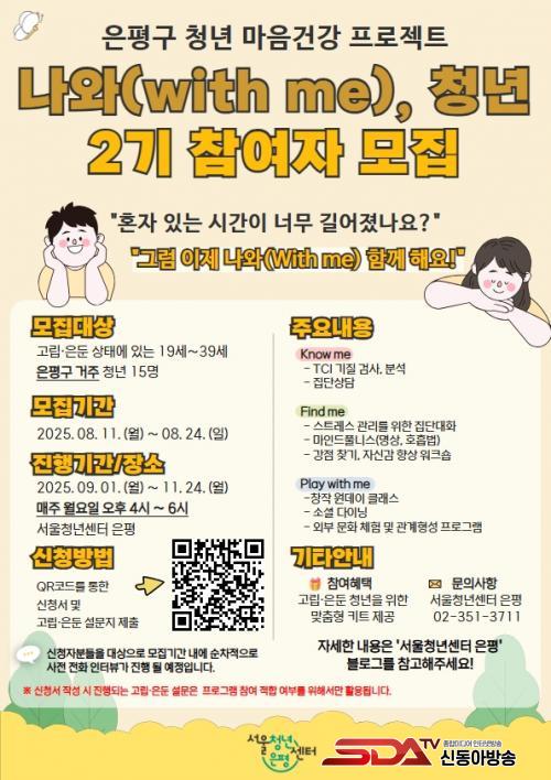 À̹ø û³â ¸¶À½°Ç° ÇÁ·ÎÁ§Æ® ¡®³ª¿Í(with me), û³â¡¯ 2±â ÇÁ·Î±×·¥Àº 9¿ùºÎÅÍ 11¿ù±îÁö 3°³¿ù°£ ÃÑ 12ȸ ÁøÇàµÇ¸ç, ÀºÆòÇü ´Ü°èÀû ȸº¹ ÇÁ·Î±×·¥À» ÅëÇØ »çȸ ÀçÁøÀÔ¿¡ ´ëÇÑ ºÎ´ã°¨À» ¿ÏÈÇÒ ¼ö ÀÖµµ·Ï µ½´Â´Ù.