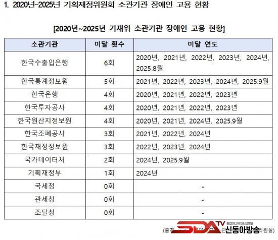 [½Åµ¿¾Æ¹æ¼Û ÀÎõ=À±¹Î½Ä±âÀÚ]±¹È¸ ±âȹÀçÁ¤À§¿øÈ¸ ¼Ò¼Ó Á¤ÀÏ¿µ ÀÇ¿ø(´õºÒ¾î¹ÎÁִ硤ÀÎõ ¿¬¼öÀ»)ÀÌ ±âȹÀçÁ¤À§¿øÈ¸ Àüü ¼Ò°ü ±â°üÀ¸·ÎºÎÅÍ Á¦Ãâ¹ÞÀº ÀڷḦ ºÐ¼®ÇÑ °á°ú, 2020³âºÎÅÍ 2025³â±îÁö ±âÀçÀ§ ¼Ò°ü 12°³ ±â°ü Áß 9°÷ÀÌ Àå¾ÖÀÎ Àǹ«°í¿ë·üÀ» ´Þ¼ºÇÏÁö ¸øÇÑ ÀûÀÌ ÀÖ´Â °ÍÀ¸·Î È®ÀεƴÙ.
