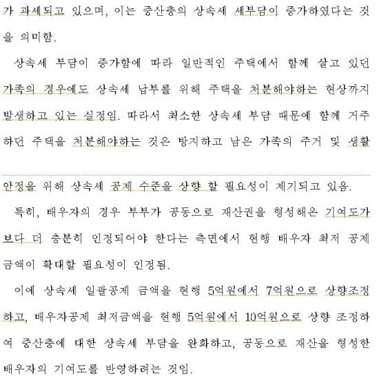 Á¤ÀÏ¿µ ÀÇ¿øÀº ¡°»ó¼Ó¼¼ ºÎ´ãÀ¸·Î °¡Á·ÀÌ ÇÔ²² »ì´ø ÁýÀ» ÀÒ´Â ÀÏÀº ¾ø¾î¾ß ÇÑ´Ù¡±¸ç,¡°Æ¯È÷ ¹è¿ìÀÚÀÇ Àç»ê Çü¼º ±â¿©µµ¸¦ ÃæºÐÈ÷ ÀÎÁ¤ÇØ Àϰý°øÁ¦ ±Ý¾×À» 5¾ï ¿ø¿¡¼ 7¾ï ¿øÀ¸·Î, ¹è¿ìÀÚ°øÁ¦ ÃÖÀú±Ý¾×À» 5¾ï ¿ø¿¡¼ 10¾ï ¿øÀ¸·Î »óÇâÇÔÀ¸·Î½á Áß»êÃþÀÇ »ó¼Ó¼¼ ºÎ´ãÀ» ¿ÏÈÇÏ°í °¡Á·ÀÇ ÁְžÈÁ¤À» º¸ÀåÇϰíÀÚ ÇÑ´Ù¡±°í ÀüÇß´Ù.