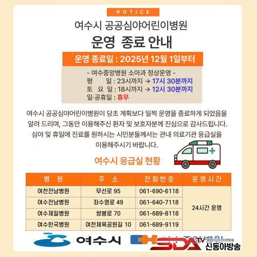 [½Åµ¿¾Æ¹æ¼Û ¿©¼ö=±è±â³² ±âÀÚ] ¿©¼ö½Ã(½ÃÀå Á¤±â¸í)´Â ¿©¼öÁß¾Óº´¿øÀÌ ¿î¿µ ÁßÀÎ ¡®¿©¼ö½Ã °ø°ø½É¾ß¾î¸°À̺´¿ø¡¯ÀÌ º´¿ø ³»ºÎ »çÁ¤À¸·Î ÀÎÇØ ´çÃÊ °èȹº¸´Ù ¾Õ´ç°Ü 2025³â 12¿ù 1ÀϺÎÅÍ ¿î¿µÀ» Á¾·áÇÑ´Ù°í ¹àÇû´Ù.