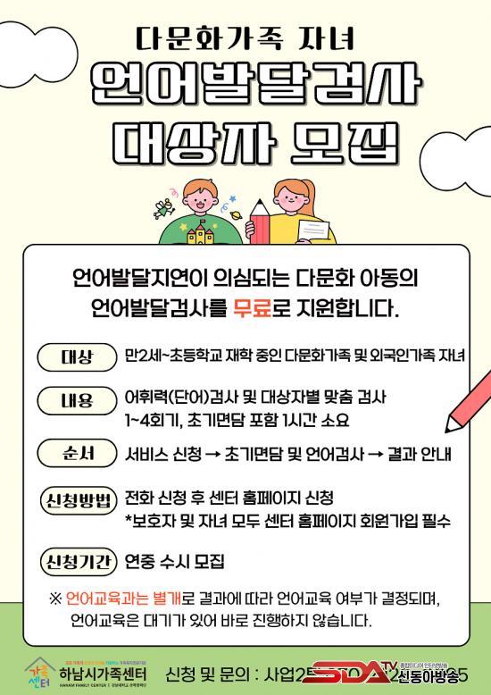 º» »ç¾÷Àº ¾ð¾î¹ß´Þ¿¡ ¾î·Á¿òÀ» °Þ´Â ´Ù¹®È­°¡Á· ¹× ¿Ü±¹Àΰ¡Á· Àڳฦ ´ë»óÀ¸·Î ¾ð¾î¹ß´Þ Á¤µµ¸¦ Æò°¡ÇÑ ÈÄ, ±³À°ÀÌ ÇÊ¿äÇÑ ¾Æµ¿¿¡°Ô ¸ÂÃãÇü ¾ð¾î ±³À°À» Á¦°øÇÏ¿© ¿øÈ°ÇÑ ¹ß´ÞÀ» µ½°í °Ç°­ÇÑ »çȸ ±¸¼º¿øÀ¸·Î ¼ºÀåÇÒ ¼ö ÀÖµµ·Ï Áö¿øÇÏ´Â °ÍÀ» ¸ñÀûÀ¸·Î ÇÑ´Ù.