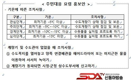 ¶ÇÇÑ ¡°±â¿ÂÀÌ ±Þ°ÝÈ÷ ¶³¾îÁú ¶§´Â °è·®±âÇÔ ³»ºÎ º¸¿Â»óŸ¦ Á¡°ËÇϰí, Àå±â°£ ¿ÜÃ⠽ÿ¡´Â ¼öµµ²ÀÁö¸¦ Á¶±Ý ¿­¾î ¹°ÀÌ È帣µµ·Ï ÇÏ´Â µî µ¿ÆÄ ¿¹¹æ¿ä·ÉÀ» ½ÇÃµÇØ Áֽñ⠹ٶõ´Ù¡±¸ç, ¡°µ¿ÆÄ µî ºÒÆí »çÇ× ¹ß»ý ½Ã °üÇÒ ½Ã±º »ó¼öµµºÎ¼­(¾ß°£ ´çÁ÷½Ç)·Î Áï½Ã ¿¬¶ôÇØ ´Þ¶ó¡±°í ´çºÎÇß´Ù.