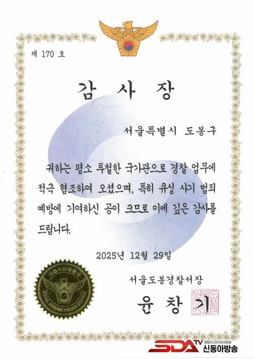 [½Åµ¿¾Æ¹æ¼Û µµºÀ±¸=À̽ŵ¿±âÀÚ] ¼­¿ï µµºÀ±¸°¡ Å¥½Ì(Qshing) »ç±â ¿¹¹æ Ȱµ¿ °ø·Î¸¦ ÀÎÁ¤¹Þ¾Æ ¼­¿ïµµºÀ°æÂû¼­·ÎºÎÅÍ °¨»çÀåÀ» ¹Þ¾Ò´Ù.