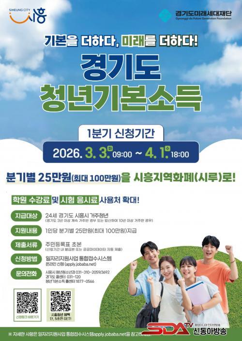 À̹ø 1ºÐ±â ½Åû ´ë»óÀº ½ÅûÀÏ ±âÁØ ½ÃÈï½Ã¿¡ Áֹεî·ÏÀ» µÐ 24¼¼(2001³â 1¿ù 2ÀÏ»ý~2002³â 1¿ù 1ÀÏ»ý) û³âÀ¸·Î, °æ±âµµ¿¡¼ ÃÖ±Ù 3³â ÀÌ»ó ¿¬¼Ó ¶Ç´Â ÇÕ»ê 10³â ÀÌ»ó °ÅÁÖ¿ä°ÇÀ» ÃæÁ·ÇØ¾ß ÇÑ´Ù. ±âÃÊ»ýȰ¼ö±ÞÀÚÀÇ °æ¿ì, ¼ö±ÞÀÚ Áõ¸í¿øÀ» Á¦ÃâÇϸé ÀϽñÝ(100¸¸ ¿ø)À¸·Î û³â±âº»¼ÒµæÀ» ¹ÞÀ» ¼ö ÀÖ´Ù.