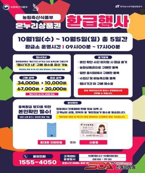 Çà»ç ±â°£ µ¿¾È ±¹³»»ê ½Å¼± ³óÃà»ê¹°À» ±¸¸ÅÇÑ ¼ÒºñÀÚ¿¡°Ô ±¸¸Å ±Ý¾×¿¡ µû¶ó ÃÖ´ë 30%±îÁö ¿Â´©¸®»óǰ±ÇÀ¸·Î ȯ±ÞÇØ ÁØ´Ù. 1Àδç ȯ±Þ Çѵµ´Â 2¸¸ ¿øÀÌ¸ç ±¸¸Å ±Ý¾×¿¡ µû¶ó ȯ±Þ ±Ý¾×ÀÌ ´Þ¶óÁø´Ù.