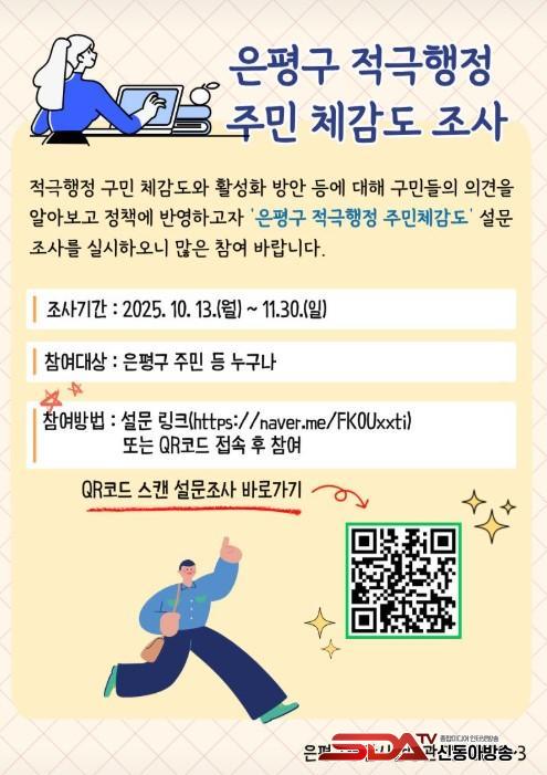 [½Åµ¿¾Æ¹æ¼Û ÀºÆò±¸=À̽ŵ¿±âÀÚ] ¼­¿ï ÀºÆò±¸´Â ±¸¹ÎÀÌ ¸¸Á·Çϰí ü°¨ÇÏ´Â Àû±ØÇàÁ¤À» ÆîÄ¡±â À§ÇØ ¡®Àû±ØÇàÁ¤ ÁÖ¹Îü°¨µµ ¼³¹®Á¶»ç¡¯¸¦ 11¿ù 30ÀϱîÁö ½Ç½ÃÇÑ´Ù°í ¹àÇû´Ù.