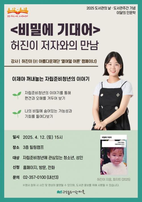 [½Åµ¿¾Æ¹æ¼Û ÀºÆò±¸=À̽ŵ¿±âÀÚ] ÀºÆò±¸´Â 2025³â µµ¼­°üÀÇ ³¯¡¤µµ¼­°ü ÁÖ°£À» ¸Â¾Æ ¿À´Â 12ÀÏ ¿ÀÈÄ 3½Ã, ÀÌ´ÞÀÇ Àι®ÇÐ °­¿¬À¸·Î ¡®ºñ¹Ð¿¡ ±â´ë¾î¡¯ ÇãÁøÀÌ ÀúÀÚ¿ÍÀÇ ¸¸³²À» °³ÃÖÇÑ´Ù°í ¹àÇû´Ù. À̹ø °­¿¬Àº ¡®ÀÌÁ¦¾ß ²¨³»³õ´Â ÀÚ¸³Áغñû³âÀÇ À̾߱⡯¸¦ ÁÖÁ¦·Î ÀÚ¡¦