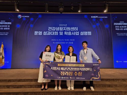 [½Åµ¿¾Æ¹æ¼Û ½ÃÈï½Ã=À̽ŵ¿±âÀÚ] ½ÃÈï½Ã´Â Áö³­ 6¿ù 25ÀÏ ¼­¿ï ¿ë»ê±¸ Çǽº¾ØÆÄÅ©ÄÁº¥¼Ç¿¡¼­ ¿­¸° ¡®2025³â °Ç°­»ýȰÁö¿ø¼¾ÅÍ ¿î¿µ ¼º°ú´ëȸ¡¯¿¡¼­ ¹è°ð°Ç°­»ýȰÁö¿ø¼¾ÅͰ¡ ¿ì¼ö±â°üÀ¸·Î ¼±Á¤µÅ Àå·Á»ó(Çѱ¹°Ç°­ÁõÁø°³¹ß¿øÀå»ó)À» ¼ö»óÇß´Ù°í ¹àÇû´Ù. º¸°Çº¹ÁöºÎ¿Í ÇÑ¡¦