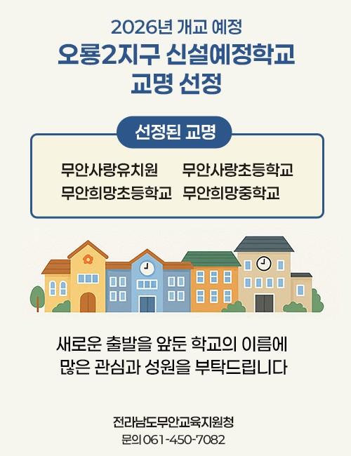 [½Åµ¿¾Æ¹æ¼Û Àü³²¹«¾È=À̽ŵ¿±âÀÚ] Àü¶ó³²µµ¹«¾È±³À°Áö¿øÃ»Àº 2025³â 6¿ù 23ÀÏ °³ÃÖÇÑ ¹«¾È ¿À·æ2Áö±¸ ½Å¼³Çб³ ±³¸í¼±Á¤À§¿øÈ¸ ȸÀÇ °á°ú 2026³â °³±³ ¿¹Á¤ÀÎ À¯¡¤ÃÊ¡¤Áß 4°³±³ÀÇ ±³¸íÀ» ¼±Á¤Çß´Ù°í ¹àÇû´Ù. À̹ø ±³¸í °ø¸ð´Â Áö³­ 5¿ù 26ÀϺÎÅÍ 6¿ù 9ÀϱîÁö Áö¿ª ÁÖ¡¦