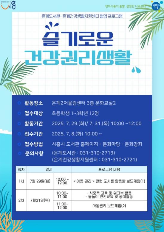 [½Åµ¿¾Æ¹æ¼Û ½ÃÈï½Ã=À̽ŵ¿±âÀÚ] ½ÃÈï½Ã Àº°èµµ¼­°ü°ú Àº°è°Ç°­»ýȰÁö¿ø¼¾ÅͰ¡ ¿À´Â 7¿ù 29Àϰú 31ÀÏ, ¿©¸§¹æÇÐÀ» ¸ÂÀÌÇÑ ÃʵîÇлýÀ» ´ë»óÀ¸·Î Çù¾÷ ÇÁ·Î±×·¥ ¡®½½±â·Î¿î °Ç°­±Ç¸®»ýȰ¡¯À» ¿î¿µÇÑ´Ù. À̹ø ÇÁ·Î±×·¥Àº ÃʵîÇб³ 1~3Çг⠾Ƶ¿À» ´ë»óÀ¸·Î ¾Æµ¿ ±Ç¸® ÀΡ¦