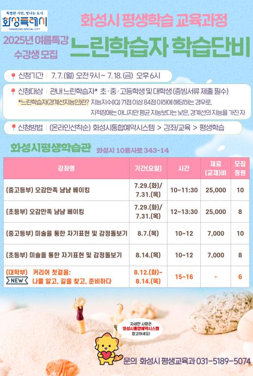 [½Åµ¿¾Æ¹æ¼Û=ÀÌÀçö±âÀÚ] È­¼ºÆ¯·Ê½Ã(½ÃÀå Á¤¸í±Ù)°¡ 7ÀϺÎÅÍ ¿À´Â 18ÀϱîÁö 2025³â ´À¸°ÇнÀÀÚ ÇнÀ´Üºñ ¿©¸§Æ¯°­ ¼ö°­»ýÀ» ¼±Âø¼ø ¸ðÁýÇÑ´Ù. ´À¸°ÇнÀÀÚ ÇнÀ´Üºñ °úÁ¤Àº ÇзɱâÀÇ ´À¸°ÇнÀÀÚ(°æ°è¼± Áö´ÉÀÎ)ÀÇ ÇнÀ´É·Â ÀúÇÏ¿¡ µû¸¥ ¾î·Á¿ò°ú ÀϹÝÇнÀÀÚ¿ÍÀÇ ÇнÀ¡¦