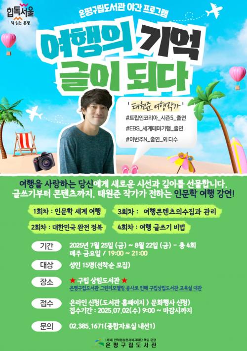[½Åµ¿¾Æ¹æ¼Û ÀºÆò±¸=À̽ŵ¿±âÀÚ] ¼­¿ï ÀºÆò±¸´Â ÀºÆò±¸¸³µµ¼­°üÀÌ ¿À´Â 25ÀϺÎÅÍ ³»´Þ 22ÀϱîÁö ¾ß°£ Àι®ÇÐ ÇÁ·Î±×·¥ ¡®¿©ÇàÀÇ ±â¾ï, ±ÛÀÌ µÇ´Ù¡¯¸¦ ¿î¿µÇÑ´Ù°í ¹àÇû´Ù. À̹ø ÇÁ·Î±×·¥Àº ¸ÅÁÖ ±Ý¿äÀÏ Àú³á, ÃÑ 4ȸ¿¡ °ÉÃÄ ÁøÇàµÇ¸ç, ÀºÆò±¸¸³µµ¼­°üÀÇ ±×¸°¸®¸ðµ¨¸µ ¡¦