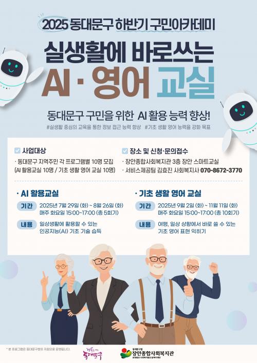 [½Åµ¿¾Æ¹æ¼Û µ¿´ë¹®±¸=À̽ŵ¿±âÀÚ] ¼­¿ï µ¿´ë¹®±¸´Â 7¿ù ¸»ºÎÅÍ ¡®2025 ÇϹݱ⠱¸¹Î ¾ÆÄ«µ¥¹Ì¡¯¸¦ ¿î¿µÇÑ´Ù. ±¸¹Î ¾ÆÄ«µ¥¹Ì´Â °ü³» °ø°ø½Ã¼³ÀÇ Æ¯¼ºÀ» »ì¸° Æò»ýÇнÀ ÇÁ·Î±×·¥À» ÅëÇØ Áö¿ª Áֹο¡°Ô ´Ù¾çÇÑ ¹è¿òÀÇ ±âȸ¸¦ Á¦°øÇϰí, ½Ç»ýȰ¿¡ À¯ÀÍÇÑ Áö½Ä°ú ±â¼úÀ» ÀÍ¡¦
