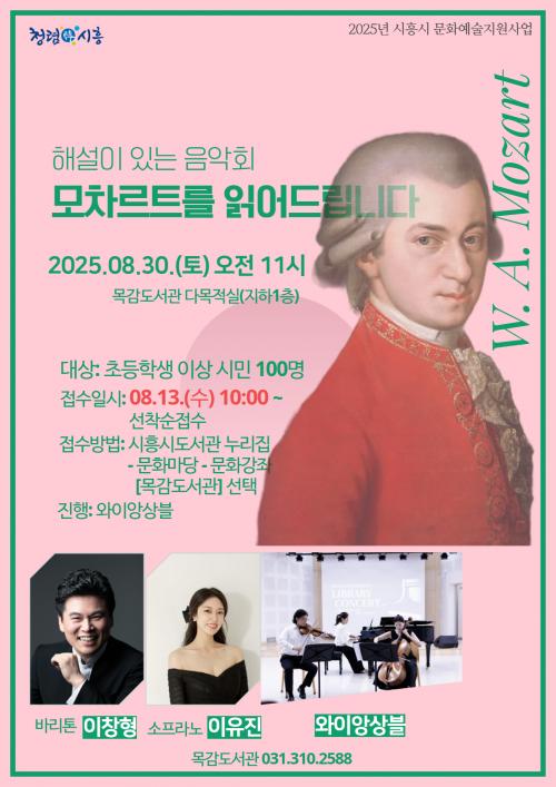 [½Åµ¿¾Æ¹æ¼Û ½ÃÈï½Ã=À̽ŵ¿±âÀÚ] ½ÃÈï½Ã¸ñ°¨µµ¼­°üÀº 8¿ù 30ÀÏ ¿ÀÀü 11½Ã, µµ¼­°ü ³» ´Ù¸ñÀû½Ç¿¡¼­ Áö¿ª ÁÖ¹ÎÀ» À§ÇÑ ÇØ¼³ÀÌ ÀÖ´Â À½¾Çȸ ¡®¸ðÂ÷¸£Æ®¸¦ Àоîµå¸³´Ï´Ù¡¯¸¦ ¿î¿µÇÑ´Ù. À̹ø °ø¿¬Àº ¿ÍÀ̾ӻóºíÀÇ ¿¬ÁÖ¿Í ÇØ¼³À» ÅëÇØ ¸ðÂ÷¸£Æ®ÀÇ ´ëÇ¥ ÀÛǰÀ» ¼Ò°³Çϰí, ±×ÀÇ¡¦