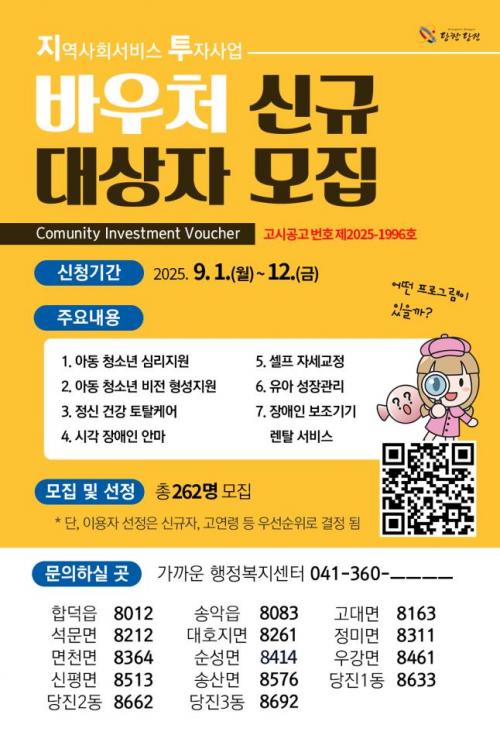 [½Åµ¿¾Æ¹æ¼Û=ÀÌÀçö±âÀÚ] ´çÁø½Ã´Â 9¿ù 1ÀϺÎÅÍ 12ÀϱîÁö ¡®2025³â ÇϹݱâ Áö¿ª»çȸ¼­ºñ½º ÅõÀÚ»ç¾÷¡¯ ÀÌ¿ëÀÚ 262¸íÀ» ¸ðÁýÇÑ´Ù. Áö¿ª»çȸ¼­ºñ½ºÅõÀÚ»ç¾÷Àº Áö¹æÀÚÄ¡´Üü°¡ Áö¿ªÆ¯¼º°ú ÁÖ¹ÎÀÇ º¹Áö ¼ö¿ä¿¡ ¸Â´Â »çȸ¼­ºñ½º¸¦ ¹ß±¼ÇØ, »ó´ã ¹× Ä¡·á µî ¼­ºñ½º°¡ ÇÊ¿äÇÑ¡¦