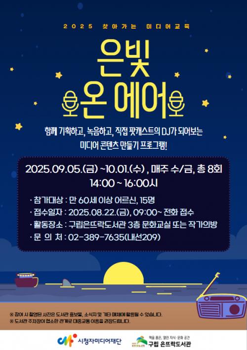 [½Åµ¿¾Æ¹æ¼Û ÀºÆò±¸=À̽ŵ¿±âÀÚ] ¼­¿ï ÀºÆò±¸´Â ±¸¸³ Àº¶ß¶ôµµ¼­°ü¿¡¼­ ¾î¸£½ÅÀ» ´ë»óÀ¸·Î ¡®Àººû ¿Â ¿¡¾î¡¯ ÇÁ·Î±×·¥À» ¿î¿µÇÑ´Ù°í ¹àÇû´Ù. À̹ø ÇÁ·Î±×·¥Àº ½ÃûÀڹ̵ð¾îÀç´ÜÀÌ ÁÖÃÖÇÏ´Â ¡®2025³â ã¾Æ°¡´Â ¹Ìµð¾î ±³À°¡¯ »ç¾÷¿¡ ¼±Á¤µÅ ¸¶·ÃµÆ´Ù. ¡®Àººû ¿Â ¿¡¾î¡¯¡¦