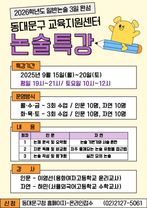 [½Åµ¿¾Æ¹æ¼Û µ¿´ë¹®±¸=À̽ŵ¿±âÀÚ] ¼­¿ï µ¿´ë¹®±¸´Â ¡®2026Çг⵵ ³í¼úÀüÇü ´ëºñ Ư°­¡¯À» 9¿ù 15ÀϺÎÅÍ 20ÀϱîÁö µ¿´ë¹®±¸ ±³À°Áö¿ø¼¾ÅÍ(¿Õ»ê·Î 25, 7Ãþ)¿¡¼­ ¿î¿µÇÑ´Ù°í ¹àÇû´Ù. ´ëÀÔÀ» ÁغñÇÏ´Â ¼öÇè»ýµéÀÇ ¼º°øÀûÀÎ ³í¼úÀüÇü ´ëºñ¸¦ À§ÇÑ À̹ø Ư°­Àº ÃÖ±Ù ´ëÀÔ¡¦