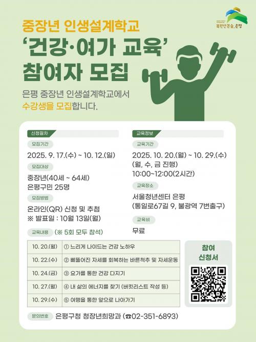 [½Åµ¿¾Æ¹æ¼Û ÀºÆò±¸=À̽ŵ¿±âÀÚ] ¼­¿ï ÀºÆò±¸´Â ÁßÀå³âÃþÀÌ °Ç°­ÇÏ°Ô ³ªÀÌ µé°í Ȱ±âÂù ¿©°¡»ýȰÀ» ´©¸± ¼ö ÀÖµµ·Ï µ½±â À§ÇØ ¡®ÁßÀå³â Àλý¼³°èÇб³ °Ç°­¡¤¿©°¡ ±³À° °úÁ¤¡¯ Âü¿©ÀÚ¸¦ ¸ðÁýÇÑ´Ù°í ¹àÇû´Ù. À̹ø ±³À°Àº 10¿ù 20ÀϺÎÅÍ 29ÀϱîÁö ¼­¿ïû³â¼¾ÅÍ ÀºÆò¿¡¼­¡¦