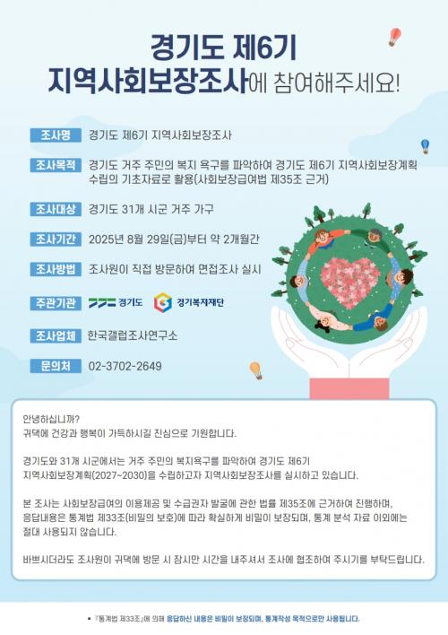 [½Åµ¿¾Æ¹æ¼Û ½ÃÈï½Ã=À̽ŵ¿±âÀÚ] ½ÃÈï½Ã´Â 9¿ù 15ÀϺÎÅÍ 10¿ù 31ÀϱîÁö °æ±âµµ ¹× °æ±âµµº¹ÁöÀç´Ü°ú ÇÔ²² 1,975°¡±¸¸¦ ´ë»óÀ¸·Î ¡®2025³â °æ±âµµ Áö¿ª»çȸº¸ÀåÁ¶»ç¡¯¸¦ ½Ç½ÃÇÑ´Ù. À̹ø Á¶»ç´Â Áö¿ªÁÖ¹ÎÀÇ »ýȰ½ÇÅÂ¿Í º¹Áö ¿å±¸¸¦ Á¾ÇÕÀûÀ¸·Î ÆÄ¾ÇÇØ, ÇâÈÄ ¼ö¸³µÉ Á¦¡¦