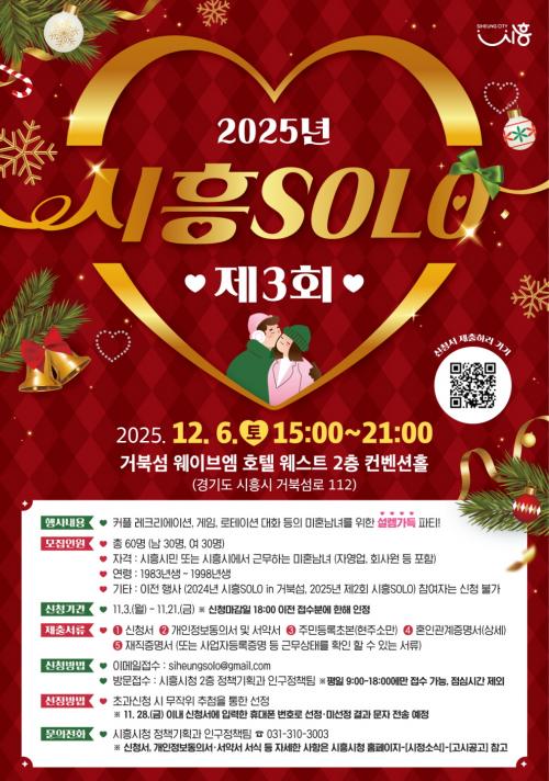 [½Åµ¿¾Æ¹æ¼Û ½ÃÈï½Ã=À̽ŵ¿±âÀÚ] ½ÃÈï½Ã´Â ¸¸³²ÀÇ ±âȸ°¡ ºÎÁ·ÇÑ Ã»Ãá³²³àµé¿¡°Ô ¼ÒÁßÇÑ Àο¬À» ¸¸³¯ ±âȸ¸¦ Á¦°øÇÏ°í °áÈ¥ ģȭ ºÐÀ§±â¸¦ Á¶¼ºÇϱâ À§ÇØ ¡®2025³â Á¦3ȸ ½ÃÈï ¼Ö·Î(SOLO)¡¯ Çà»ç¸¦ °³ÃÖÇϰí, ¹ÌÈ¥³²³à Âü°¡ÀÚ¸¦ ¸ðÁýÇÑ´Ù. Çà»ç´Â ¿À´Â 12¿ù 6ÀÏ ¿ÀÈÄ¡¦