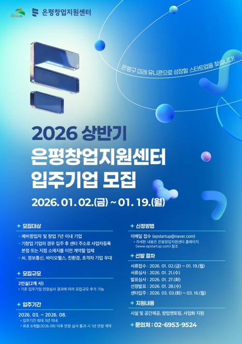 [½Åµ¿¾Æ¹æ¼Û ÀºÆò±¸=À̽ŵ¿±âÀÚ] ¼­¿ï ÀºÆò±¸´Â ¡®2026³âµµ »ó¹Ý±â ÀºÆòâ¾÷Áö¿ø¼¾ÅÍ ÀÔÁÖ±â¾÷¡¯À» ¿À´Â 19ÀϱîÁö ¸ðÁýÇÑ´Ù°í ¹àÇû´Ù. ÀºÆòâ¾÷Áö¿ø¼¾ÅÍ´Â À¯¸Á â¾÷±â¾÷¿¡ ÀÔÁÖ °ø°£°ú ÁýÁß º¸À° ÇÁ·Î±×·¥À» Á¦°øÇØ ¹Ì·¡ ¼ºÀå±â¾÷À¸·Î À°¼ºÇϴ â¾÷ °ÅÁ¡ ½Ã¼³ÀÌ´Ù¡¦