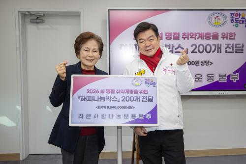 [½Åµ¿¾Æ¹æ¼Û µ¿´ë¹®±¸=À̽ŵ¿±âÀÚ] µ¿´ë¹®±¸´Â 29ÀÏ ¿ÀÀü 9½Ã 30ºÐ, ÀÛÀº»ç¶û³ª´®¿îµ¿º»ºÎ°¡ Àú¼Òµæ °¡Á¤À» À§ÇÑ ¼³ ¸íÀý ¸ÂÀÌ ¡®µû¶æÇѰܿﳪ±â ÇØÇdzª´®¹Ú½º¡¯ 200¹Ú½º(ȯ°¡¾× ¾à 964¸¸¿ø)¸¦ Àü´ÞÇß´Ù°í ¹àÇû´Ù. µ¿´ë¹®±¸Ã»¿¡¼­ ¿­¸° À̳¯ Àü´Þ½Ä¿¡´Â ÀÌÇÊÇü µ¿´ë¹®¡¦