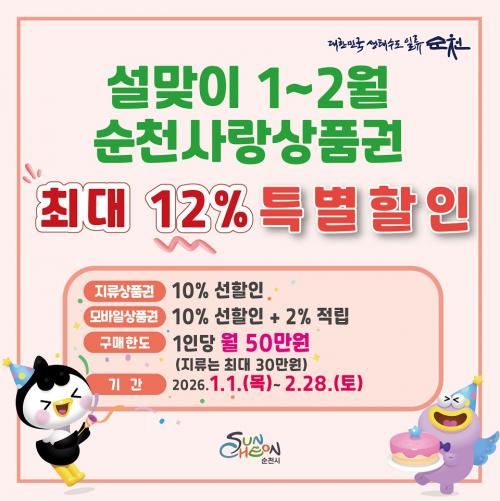 [½Åµ¿¾Æ¹æ¼Û ¼øÃµ=±è¿ëÈÆ ±âÀÚ] ¼øÃµ½Ã´Â ½Ã¹ÎµéÀÇ Àå¹Ù±¸´Ï ºÎ´ãÀ» ´ú°í Áö¿ª ³» ¼Òºñ¸¦ ÃËÁøÇϱâ À§ÇØ 1¿ùºÎÅÍ ÃßÁø ÁßÀÎ ¼øÃµ»ç¶û»óǰ±Ç ÇÒÀÎÇà»ç¸¦ ¼³ ¸íÀýÀ» Æ÷ÇÔÇØ 2¿ù ¸»±îÁö Áö¼Ó ¿î¿µÇÑ´Ù°í ¹àÇû´Ù. ½Ã¿¡ µû¸£¸é 2026³â 1¿ùºÎÅÍ ÁøÇà ÁßÀÎ ¼øÃµ»ç¶û»óǰ±Ç ¡¦