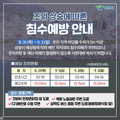 [½Åµ¿¾Æ¹æ¼Û=±è±¤½Ä±âÀÚ] ¸ñÆ÷½Ã´Â ´ëÁ¶±âÀÎ ¿À´Â 31ÀϺÎÅÍ 9¿ù 3ÀÏ(¿ÀÀü 2½Ã ~ 7½Ã) »çÀÌ ¹Ù´å¹° ¼öÀ§°¡ 5.1m ÀÌ»ó (Á¶¼®Ç¥»ó 9/1 ÃÖ°í 5.16m) »ó½Â ¿¹»óµÊ¿¡ µû¶ó ÇÇÇØ¸¦ ÀÔÁö ¾Êµµ·Ï öÀúÇÑ ´ëºñ¸¦ ´çºÎÇß´Ù.