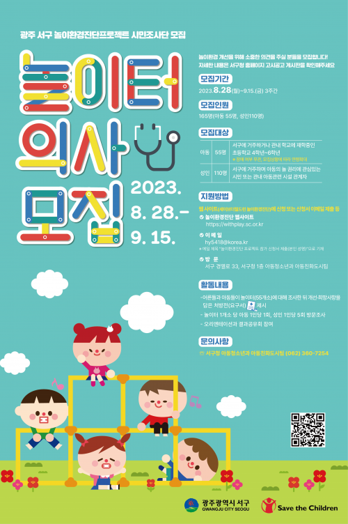 [½Åµ¿¾Æ¹æ¼Û=ÃÖ¿ëÀϱâÀÚ] ±¤ÁÖ±¤¿ª½Ã ¼­±¸(±¸Ã»Àå ±èÀ̰­)´Â ¿À´Â 9¿ù 15ÀϱîÁö ¾ÆÀ̵éÀÇ ³îÀÌȯ°æ °³¼±À» À§ÇÑ ½Ã¹ÎÁ¶»ç´Ü ¡®³îÀÌÅÍ Àǻ硯¸¦ ¸ðÁýÇÑ´Ù.