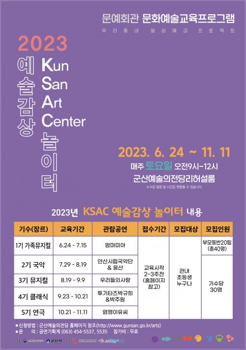 [½Åµ¿¾Æ¹æ¼Û=À̽¿¬±âÀÚ] ±º»ê½Ã´Â ¿¹¼úÀÇÀü´çÀÌ ±¹ºñ°ø¸ð»ç¾÷ÀÎ 23³â ¹®¿¹È¸°ü ¹®È­¿¹¼ú±³À°ÇÁ·Î±×·¥ Áö¿ø»ç¾÷ÀÎ ¡¸KSAC ¿¹¼ú°¨»ó ³îÀÌÅÍ¡¹ 4±â Ŭ·¡½Ä ¼ö¾÷À» ¿À´Â 23ÀϺÎÅÍ ½ÃÀÛÇÑ´Ù°í ¹àÇû´Ù.