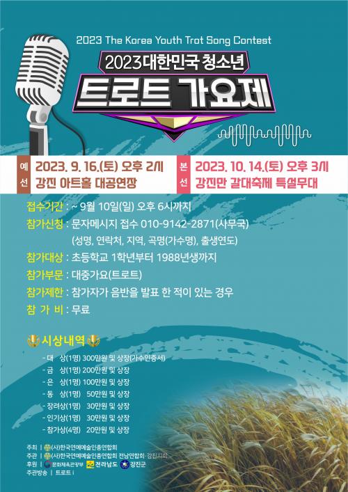 À̹ø 2023 ´ëÇѹα¹ û¼Ò³â Æ®·ÎÆ® °¡¿äÁ¦´Â ´ë»ó 1¸í¿¡°Ô »ó±Ý 300¸¸¿ø°ú °¡¼ö ÀÎÁõ¼­¸¦ ÁÖ´Â »óÀåÀÌ ¼ö¿©µÇ¸ç ±× À̿ܿ¡µµ 9¸íÀÇ ½Ã»óÀÚ¿¡°Ô »óÀå ¹× »ó±ÝÀÌ ¼ö¿©µÉ ¿¹Á¤ÀÌ´Ù.