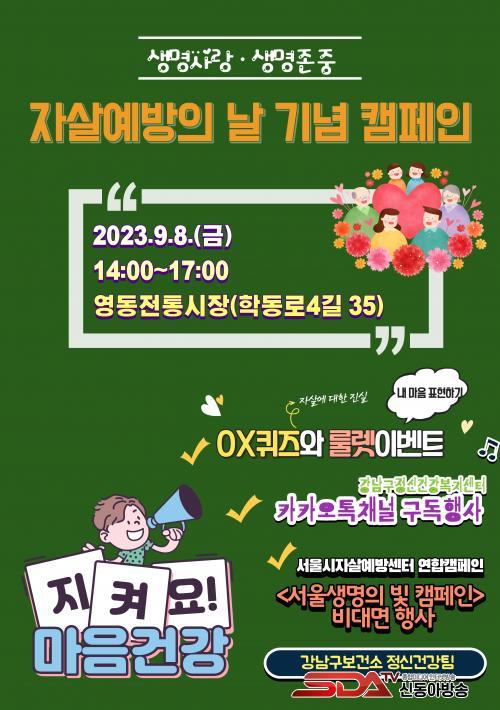 ±¸´Â 8ÀÏ ¿ÀÈÄ 2½ÃºÎÅÍ 5½Ã±îÁö ¿µµ¿ÀüÅë½ÃÀå(Çе¿·Î4±æ 35)¿¡¼­ Àڻ쿹¹æ Ä·ÆäÀÎÀ» ½Ç½ÃÇÑ´Ù. Àڻ쿹¹æ Áֹΰøµ¿Ã¼ ¡®¸¶À½°Ç°­Áֹα³À°´Ü¡¯ 13¸í°ú ÇÔ²² ·ê·¿À» Ȱ¿ëÇØ ³ª¿Í ŸÀο¡°Ô À§·Î¿Í Èñ¸ÁÀÇ ¸¶À½ Ç¥ÇöÇϱâ, Àڻ쿡 ¿Ã¹Ù¸¥ Á¤º¸¸¦ Á¦°øÇÏ´Â OX ÄûÁî, °­³²±¸Á¤½Å°Ç°­º¹Áö¼¾ÅÍ Ä«Ä«¿ÀÅåä³Î ±¸µ¶ À̺¥Æ®, ¼­¿ï½Ã Àڻ쿹¹æ¼¾ÅÍ ¿¬ÇÕÄ·ÆäÀÎ ¡®¼­¿ï»ý¸íÀÇ ºû Ä·ÆäÀΡ¯ ¿Â¶óÀÎ Âü¿© È«º¸ µîÀ¸·Î ÀÌ·ïÁø´Ù. Ä·ÆäÀο¡ Âü¿©ÇÑ ±¸¹Î°ú »óÀε鿡°Ô Áö¼ÓÀûÀÎ ¸¶À½ °Ç°­°ü¸®¸¦ À§ÇÑ µµ¿ò±â°ü Á¤º¸ ¾È³» ¹× È«º¸¹°À» Á¦°øÇÑ´Ù.