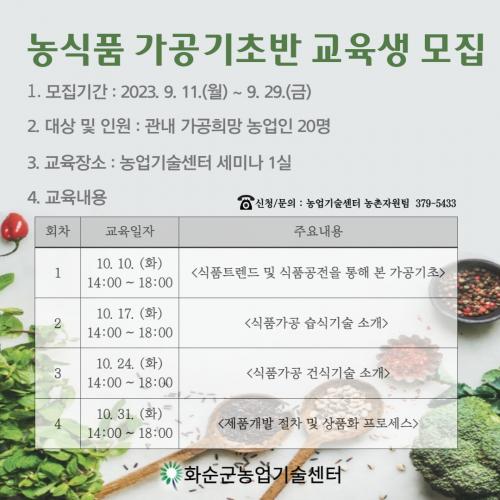 [½Åµ¿¾Æ¹æ¼Û=·ù¾ð¿­±âÀÚ] È­¼ø±º(±º¼ö ±¸º¹±Ô)Àº ³ó»ê¹° °¡°ø¿¡ ´ëÇÑ Àü¹®Áö½Ä ÇÔ¾ç°ú °¡°ø»ê¾÷ Ȱ¼ºÈ­¸¦ À§ÇØ ¿À´Â 29ÀϱîÁö 2023³â ³ó»ê¹° °¡°ø ±âÃÊ¹Ý ±³À°»ýÀ» ¸ðÁýÇÑ´Ù.