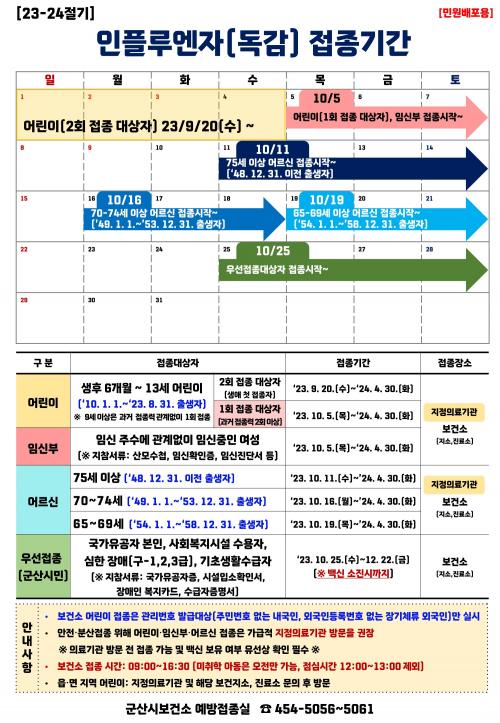 Á¢Á¾ ´ë»óÀº 65¼¼ ÀÌ»ó ¾î¸£½Å(1958. 12. 31. ÀÌÀü Ãâ»ýÀÚ)À̸ç, ¾ÈÀüÇÑ ¿¹¹æÁ¢Á¾ ½ÃÇàÀ» À§ÇØ ¿¬·É´ë¸¦ ±¸ºÐÇØ ½Ç½ÃÇÑ´Ù. 75¼¼ ÀÌ»óÀº 10¿ù 11ÀϺÎÅÍ, 70~74¼¼´Â 10¿ù 16ÀϺÎÅÍ, 65~69¼¼´Â 10¿ù 19ÀϺÎÅÍ ÁÖ¼ÒÁö °ü°è¾øÀÌ Àü±¹ ÁöÁ¤ À§Å¹ÀÇ·á±â°ü¿¡¼ ¹«·á·Î Á¢Á¾ÇÒ ¼ö ÀÖ´Ù.