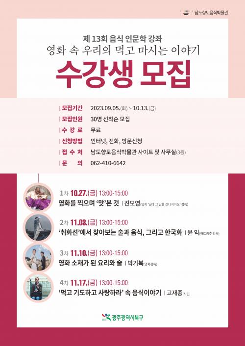 ¿ÃÇØ·Î 13¹øÂ°¸¦ ¸ÂÀº À̹ø °­Á´ ¡®¿µÈ­ ¼Ó ¿ì¸®ÀÇ ¸Ô°í ¸¶½Ã´Â À̾߱⡯¸¦ ÁÖÁ¦·Î ³²µµÇâÅäÀ½½Ä¹Ú¹°°ü¿¡¼­ ¿î¿µ ±â°£ Áß ¸ÅÁÖ ±Ý¿äÀÏ ¿ÀÈÄ 1½ÃºÎÅÍ 3½Ã±îÁö ȸ´ç 30¿© ¸íÀÇ ÁÖ¹ÎÀ» ´ë»óÀ¸·Î ÃÑ 4ȸ¿¡ °ÉÃÄ ÁøÇàµÈ´Ù.