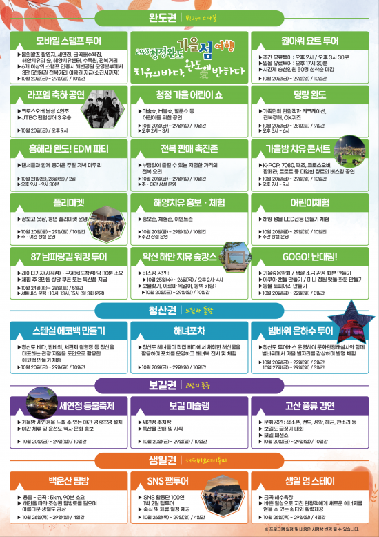 [½Åµ¿¾Æ¹æ¼Û=À̺´½Ä±âÀÚ] ¡¸2023 ûÁ¤ ¿Ïµµ °¡À» ¼¶ ¿©ÇࡹÀÌ 10¿ù 20ÀϺÎÅÍ 29ÀϱîÁö û»êµµ, º¸±æµµ, »ýÀϵµ µî ¼¶ ±Ç¿ª°ú ¿Ïµµ ÇØº¯°ø¿ø, ¾à»ê ÇØ¾ÈÄ¡À¯ÀÇ ½£ µî¿¡¼­ ¿­¸°´Ù.