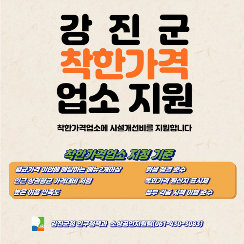 ÂøÇѰ¡°Ý¾÷¼Ò ÁöÁ¤ ±âÁØÀº °­Áø±º ¼ÒÀç ¿Ü½Ä¾÷, ÀÌ¡¤¹Ì¿ë¾÷, ¼¼Å¹¾÷ µî ¼­ºñ½º ¾÷Á¾ °¡¿îµ¥ ¡ãÆò±Õ °¡°Ý ¹Ì¸¸¿¡ ÇØ´çÇÏ´Â ¸Þ´º 2°³ ÀÌ»ó ¡ãÀα٠»ó±Ç Æò±Õ °¡°Ý ´ëºñ Àú·Å ¡ã³ôÀº ÀÌ¿ë ¸¸Á·µµ ¡ãÀ§»ý¡¤Ã»°á Áؼö ¡ã¿Á¿Ü°¡°Ý¡¤¿ø»êÁö Ç¥½ÃÁ¦ µî Áß¾Ó ¹× ÁöÀÚü °¢Á¾ ½ÃÃ¥ ÀÌÇà µîÀ» ÁؼöÇÑ ¾÷ü °¡¿îµ¥ ¼±Á¤µÈ´Ù.