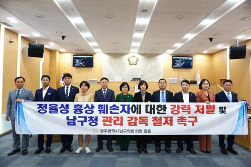 [½Åµ¿¾Æ¹æ¼Û=ÀÌÁöÇö±âÀÚ] ±¤ÁÖ±¤¿ª½Ã ³²±¸ÀÇȸ(ÀÇÀå Ȳ°æ¾Æ) ÀÇ¿øµéÀº 19ÀÏ º»È¸ÀÇÀå¿¡¼­ Á¤À²¼º Èä»ó ÈѼÕÀÚ¿¡ ´ëÇÑ °­·Â ó¹ú ¹× ³²±¸Ã» °ü¸® °¨µ¶ öÀú¸¦ Ã˱¸ÇÏ´Â ¼º¸í¼­¸¦ ¹ßÇ¥Çß´Ù.