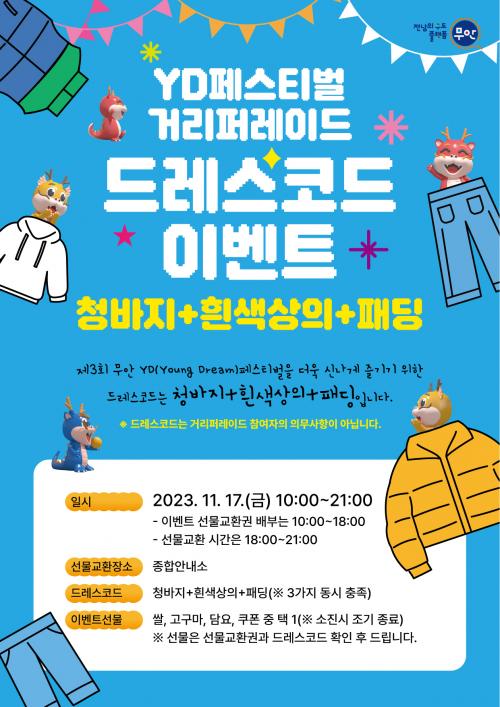 µå·¹½º ÄÚµå À̺¥Æ®´Â À۳⿡ ÀÌ¾î ¿ÃÇØµµ ÃàÁ¦ ù³¯ÀÎ 17ÀÏ¿¡ ¿ÀÀü 10½ÃºÎÅÍ ¿ÀÈÄ 9½Ã±îÁö ÁøÇàÇÑ´Ù. û¹ÙÁö, Èò»ö »óÀÇ, ÆÐµùÀ» ÀÔÀº À̺¥Æ® Âü¿©ÀÚ´Â ¿ÀÀü 10½ÃºÎÅÍ ¿ÀÈÄ 6½Ã±îÁö Çà»çÀå Á¾Çվȳ»¼Ò¿¡ ¹æ¹®ÇÏ¿© ¼±¹°±³È¯±ÇÀ» ¹ÞÀ» ¼ö ÀÖÀ¸¸ç ¿ÀÈÄ 6½ÃºÎÅÍ 9½Ã±îÁö ½Ò, °í±¸¸¶, ¹«¸´ã¿ä, û³â»ç¶û ¹«¾È»ç¶û ÄíÆù Áß ÇÑ °³¸¦ ¼±ÅÃÇÏ¿© ±³È¯¹ÞÀ» ¼ö ÀÖ´Ù.