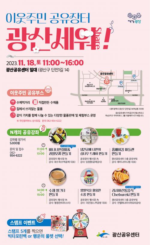 ÇÑÆí, ±¤»ê°øÀ¯¼¾ÅÍ´Â Áö³ 8¿ù8ÀÏ ¹®À» ¿¾ú´Ù. Áö¼Ó°¡´ÉÇÑ °øÀ¯µµ½Ã ±¤»ê Á¶¼ºÀ» À§ÇØ ¹°Ç°‧°ø°£‧Àç´ÉÀ» °øÀ¯ÇÏ´Â °ÅÁ¡ °ø°£ÀÌ´Ù. 118Á¾ 270¿© °³ ¹°Ç°À» ´ë¿©ÇÒ ¼ö ÀÖ°í °øÀ¯Ã¼Çè½Ç, °øÀ¯ºÎ¾ý, °øÀ¯Ã¢ÀÛ½Ç µî °ø°£À» ºô·Á ÀÌ¿ëÇÒ ¼ö ÀÖ´Ù. Àç´É °øÀ¯ ÇÁ·Î±×·¥ÀÎ ¡®N°³ÀÇ °øÀ¯°Á¡¯µµ ¿î¿µÇϰí ÀÖ´Ù.