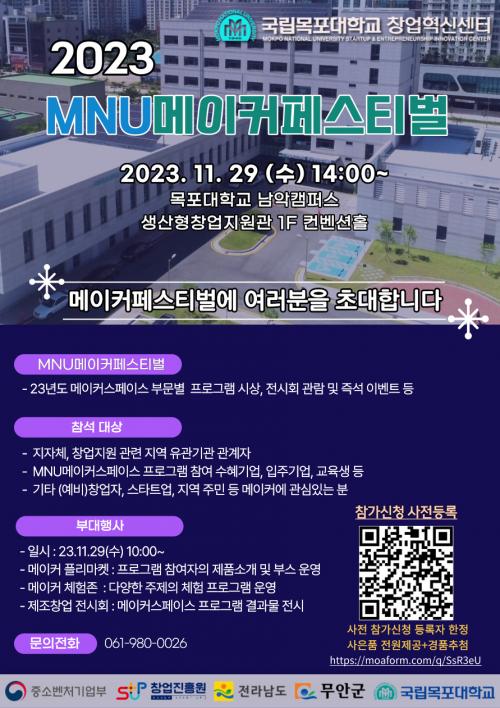 [½Åµ¿¾Æ¹æ¼Û=ÀÌÀº¼±±âÀÚ] Àü³² ¹«¾È±º(±º¼ö ±è»ê)Àº ±¹¸³¸ñÆ÷´ëÇб³ â¾÷Çõ½Å¼¾ÅÍ(¼¾ÅÍÀå À¯¿µÀç)¿¡¼­ ¿î¿µÇÏ´Â MNU¸ÞÀÌÄ¿½ºÆäÀ̽º¿¡¼­ ¿À´Â 11¿ù 29ÀÏ ¡®2023 MNU¸ÞÀÌÄ¿Æä½ºÆ¼¹ú¡¯À» °³ÃÖÇÑ´Ù°í ¹àÇû´Ù.