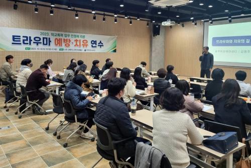 À̳¯ ¿¬¼ö¿¡¼´Â ±èÁ¤ÁÖ ±¤ÁÖÆ®¶ó¿ì¸¶¼¾ÅÍ ÆÀÀåÀÌ ¡â Æ®¶ó¿ì¸¶ÀÇ Á¤ÀÇ ¡â Æ®¶ó¿ì¸¶ Áõ»ó ¡â Æ®¶ó¿ì¸¶ Ä¡À¯, ¾î¶»°Ô ÇÒ °ÍÀΰ¡ µîÀ» ÁÖÁ¦·Î ½Ã¿¬°ú ½Ç½À ±³À°À» ÁøÇàÇß´Ù. ƯÈ÷, Çб³Æø·Â ¹Î¿ø ¹ß»ý °úÁ¤¿¡¼ ¹ß»ýÇÏ´Â »óȲÀ» °¡Á¤ÇÑ Æ®¶ó¿ì¸¶¿¡ ´ëÇØ ½ÅÈ£¸¦ ¾Ë¾ÆÂ÷¸®°í ½ÉÈ£Èí µî È¿°úÀûÀ¸·Î Æ®¶ó¿ì¸¶¸¦ Ä¡À¯ÇÏ´Â ½Ã°£À» °¡Á³´Ù.